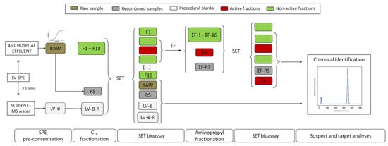 EDA was used as a prioritization tool before chemical identification. To that aim, the preconcentrated hospital and blank samples were submitted to the EDA protocol described in a previous work of the research group [41] (see details in Figure 4 and Section S2 in Supplementary Materials). Briefly, the preconcentrated hospital effluent water sample (raw) and blank sample (LV-B) were fractionated by a 2-step procedure. The first fractionation of raw and LV-B was conducted using a C18 semi-preparative column and, the toxic fractions were fractionated again using an aminopropyl semi-preparative column. A replicate of the raw sample was fractionated again and the fractions obtained in each fractionation were recombined (RS and ΣF-RS for the first and second fractionation, respectively) to assure that no analyte or bioactivity losses occurred during fractionation. The bioactivity of the raw sample (raw), recombined samples (RS and ΣF-RS), individual fractions as well as procedural (LV-B) and recombined blanks (LV-B-R) was tested using the SET bioassay (see Section 3.3.1.). In order to test the whole bioactivity in a unique fraction, the active fractions found in the first fractionation were combined (ΣF). Chemical analysis was limited to biologically active and neighboring fractions, the RS and ΣF-RS, and raw and blank samples (see Section 3.3.2).