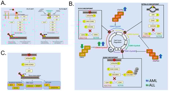 Altered cell proliferation in acute leukemias. (A) Schematic representation of the downstream signaling of wild-type (wt, left) and mutated (mut, right) FLT3 receptors. FLT3 inhibitors targeting FLT3-ITD and FLT3-TKD cells are indicated in the figure. (B) Cell cycle regulation in eukaryotic cells. The boxes represent the mechanism of action of the different cell cycle checkpoints. The arrows refer to altered activity (due to functional or genomic aberrations) of different proteins involved in cell cycle regulation found in AML (blue) and ALL (green) patients. (C) Role of p53 in the regulation of cell cycle and DNA repair.