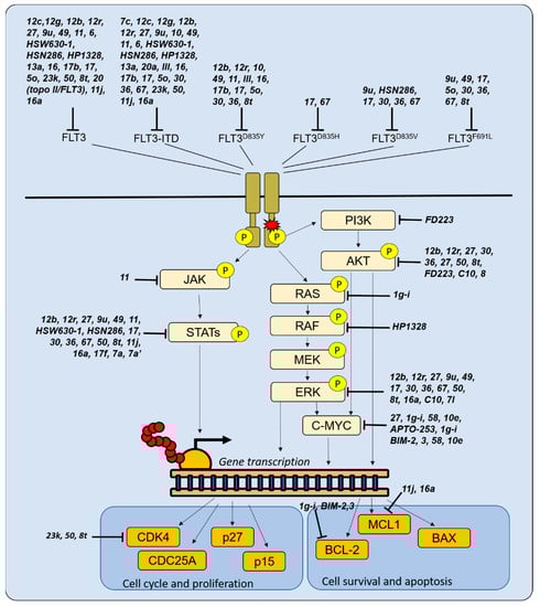 In addition to FLT3 inhibition, targeting of other proliferative signals, including kinases (e.g., PI3Kδ and STAT5) and oncogenic mechanisms (e.g., c-MYC), has raised interest in recent years (Table 3 and Figure 2).