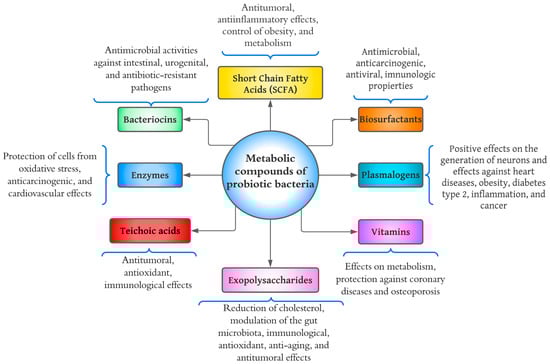 Metabolites from bacterial probiotics have been studied as they may be the main cause of positive effects on consumer health [42]. Figure 3 shows a diagram of the health effects that have been studied concerning bacterial probiotic metabolites. Various components have been investigated, including short-chain fatty acids (SCFAs), bacteriocins, enzymes, teichoic acids, exopolysaccharides (EPS), vitamins, plasmalogens, and biosurfactants.