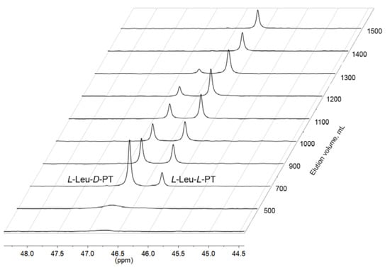 31P-NMR analysis of the elution profile of the separation of Leu-PT diastereomers on a Dowex-50WX8 column.