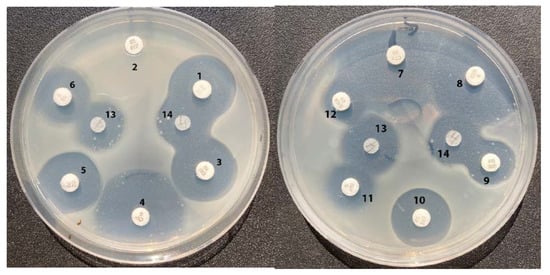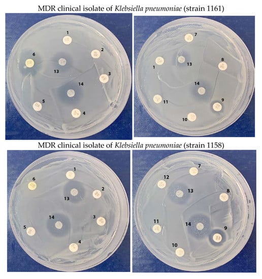 Inhibition of the growth of clinical isolates of MDR K. pneumoniae with antibiotics and peptide derivatives of phosphinothricin. (1) Amikacin, 30 μg/disk; (2) Ampicillin, 10 μg/disk; (3) Gentamicin, 10 μg/disk; (4) Ciprofloxacin, 5 μg/disk; (5) Cefazolin, 30 μg/disk; (6) Tetracycline, 30 μg/disk; (7) Cefotaxime, 30 μg/disk; (8) Levofloxacin, 5 μg/disk; (9) Polymyxin B, 300 IU/disk; (10) Tobramycin, 10 μg/disk; (11) Trimethoprim, 5 μg/disk; (12) Ampicillin/Sulbactam, 10/10 μg/disk; (13) Bialaphos, 5 μg/disk; (14) L-Leu-L-PT, 5 μg/disk.