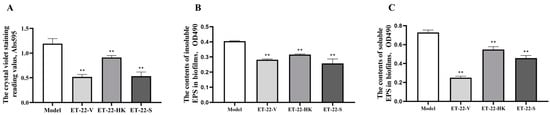 To assess the effects of L. paracasei ET-22 on S. mutans biofilms, the live bacteria, heat-killed bacteria, and secretions of L. paracasei ET-22 were used in a co-culture with S. mutans. An equal volume of bacterial solutions with a concentration of 5.5 × 108 CFU/mL was used to prepare the live bacteria (ET-22-V), heat-killed bacteria (ET-22-HK), and secretions (ET-22-S) of L. paracasei ET-22. The single pathogen S. mutans (Model) was cultured as a control. After a 24 h co-culture with S. mutans, the ET-22-V and ET-22-S groups all showed decreased crystal-violet-staining reading values (p < 0.01, Figure 1A). Surprisingly, we found that the ET-22-HK group also showed a reduced crystal-violet-staining reading value (p < 0.01, Figure 1A).