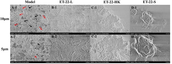 To further verify the bacteria’s inhibitory effects for S. mutans biofilms, we viewed its microstructure using scanning electron microscopy (SEM) under the 10 μm or 5 μm scales. According to the representative SEM images, the Model group showed a stable, multilayer, and reticular biofilm, in which the S. mutans was tightly wrapped with a cauliflower-like structure (Figure 2(A-1)). A small number of bacteria were exposed, and closely adhered to the “flower stalk” (black arrow) and “corolla” (red arrow) positions (Figure 2(A-2)). The ET-22-V, ET-22-HK and ET-22-S groups all showed obviously changed biofilm microstructures (Figure 2B–D). In the ET-22-V group, the multi-layer and compact cauliflower-like structure disappeared. Instead, a single-layer and loose biofilm-microstructure was exhibited, in which the bacilliform L. paracasei ET-22 and spherical S. mutans were completely exposed on the biofilms. The bindings of these two strains with the biofilms were loose (Figure 2B). Similarly, the ET-22-HK and ET-22-S groups also presented a lack of cauliflower-like structures (Figure 2C,D). In the ET-22-HK group, the heat-killed L. paracasei ET-22 and spherical S. mutans were tightly wrapped into a single-layer sheet structure (Figure 2C). The ET-22-S group showed a compact and discontinuous biofilm with a certain thickness, in which the S. mutans were tightly wrapped (Figure 2D).