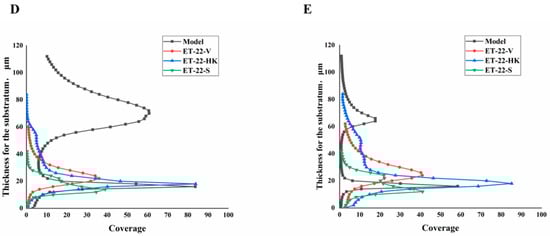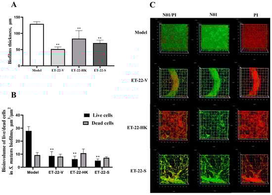 We further detected the biofilm thickness using confocal laser scanning microscopy (CLSM). Using the COMSTAT 2 analysis for CLSM views, the biofilm thicknesses are displayed. As shown in Figure 3A, compared with the Model group, the thicknesses of the S. mutans biofilms were significantly lower in the ET-22-V, ET-22-HK, and ET-22-S groups (p < 0.01, Figure 3A). After being stained with N01 and propidium iodide (PI), the live bacteria (green) and dead bacteria (red) in the biofilms were viewed (Figure 3B). Based on the COMSTAT 2 analysis, living and dead cells were respectively quantified. After the co-culture, the biomasses of live bacteria in the biofilms of the ET-22-V, ET-22-HK, and ET-22-S groups were remarkably lower than those in the Model group (p < 0.01, Figure 3C). However, there was no significant difference in the biomasses of dead bacteria among these groups (p > 0.05, Figure 3C). The vertical biofilm-coverage was checked. In the Model group, both the living bacteria and the dead bacteria in the biofilms gathered mainly at the 50–115 μm and 15–40 μm positions, above the bottom of the hydroxyapatite discs (Figure 3D,E). By contrast, the living bacteria and dead bacteria in the biofilms of the ET-22-V, ET-22-HK, and ET-22-S groups mainly gathered at the 15–40 μm position (Figure 3D,E).