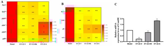 Lactate dehydrogenase (LDH), rela, RecA, and ffh are all involved in the acid production and acid tolerance of S. mutans. Compared with the Model group, the gene expressions of LDH, rela, RecA, and ffh were significantly reduced in the ET-22-V, ET-22-HK, and ET-22-S groups (p < 0.01, Figure 4B). As a component of the QS system, ComDE can regulate the intraspecific communications of S. mutans in biofilms by stimulating the competitive signaling-peptides. Compared with the Model group, the ET-22-V and ET-22-HK groups both showed similarly reduced gene-expression-levels of ComDE (p < 0.01, Figure 4C). On the contrary, the ET-22-S group showed a remarkably increased gene-expression-level of ComDE (p < 0.01, Figure 4C).