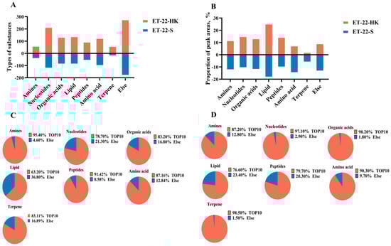 The main organic substances in heat-killed bacteria and secretions of L. paracasei ET-22. (A) The number of substance types in each kind of organic substance from heat-killed bacteria (ET-22-HK) and secretions (ET-22-S) of L. paracasei ET-22. (B) The proportion of relative peak areas for each kind of organic substance. (C) The proportion of peak areas for the top 10 substance types in each kind of organic substance from ET-22-HK. (D) The proportion of peak areas for the top 10 substance types in each kind of organic substance from ET-22-S.