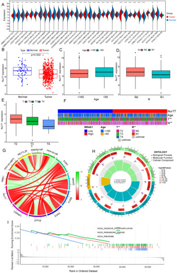 The Nur77 expression is associated with PRAD and clinicopathological features. (A) The Nur77 expression patterns of multiple kinds of tumors. (B–E) The scatter diagram showed that PRAD (B), age (C), Lymph node metastasis (D), and tumor development (E) were significantly associated with Nur77 expression. (F) Correlation between the expression levels of Nur77 and the clinicopathological features including age, Lymph node metastasis, and tumor development. (G) Co-expressed genes with Nur77, the red color represented a positive correlation, while the blue color indicated a negative correlation. (H) Gene ontology and (I) GSEA enrichment analysis of differently expressed genes in Nur77 high- and low- expression samples. (****, ***, **, * represent 0.0001, 0.001, 0.01 and 0.05).