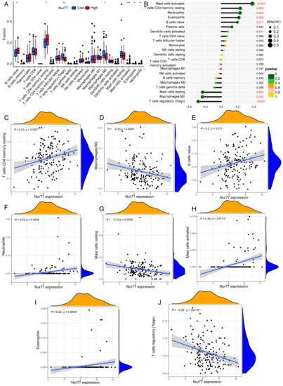 To discover the immune infiltration difference of different immune cells and immune status between high and low expression groups of Nur77, the infiltration score was quantified of diverse immune cell subpopulations. The results showed the group with low Nur77 expression levels was associated with many tumor-infiltrating immune cells, including CD8+ T cells, regulatory T cells (Treg), macrophages, and mast cells resting (Figure 2A). To further explore the potential relationship between Nur77 expression and immune infiltration, we performed an immune cell correlation analysis and discovered that Nur77 expression was positively correlated with mast cells activated, T cells CD4 memory resting, neutrophils, eosinophils, and native B cells, as well as those negatively correlated with mast cells resting, M2 macrophages, and regulatory T cells (Tregs) (Figure 2B–J). As shown in Figure 2C–J, we can see that p < 0.05, indicating that Nur77 and the immune cells are correlated.