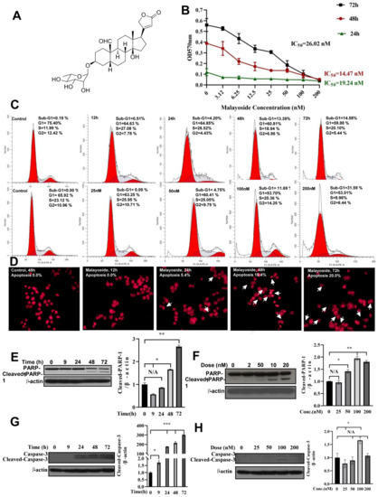 Induction of apoptosis by malayoside in LNCaP cells. (A). Schematic structure of malayoside. (B). Effect of malayoside on the growth inhibition of LNCaP cells for different incubation periods. Cells were treated with increasing concentrations of malayoside for 24, 48, and 72 h, respectively. Cell viability was measured by MTT assay. IC50 values are shown (n = 3). (C). Apoptosis induction was detected by flow cytometry (FCM) in LNCaP cells. LNCaP cells were treated at 100 nM of malayoside for 12, 24, 48, and 72 h (top panel), or treated at the indicated concentrations for 48 h (bottom panel). (D). Cell morphology was analyzed by PI staining in LNCaP cells. A nuclear fragment was seen in the cells treated with malayoside. Malayoside could induce PARP cleavage (E,F) and Caspase-3 cleavage (G,H). Cells were incubated with malayoside at the indicated time. All of the expression of apoptosis-related proteins was analyzed by western blot. Western blot bands were quantified and are shown in a histogram. The data are expressed as the mean ± SEM; * p < 0.05, ** p < 0.01, *** p < 0.001. The arrow indicates that nuclear fragmentation is observed in malayoside treated cells, suggesting that apoptosis occurs.