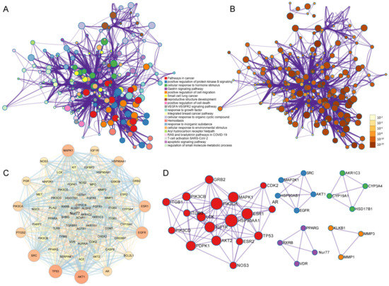 Biological enrichment and pharmacological network analysis. (A,B). Visual function enrichment analysis by Metascape. (C,D). PPI diagram of the common target network between Malayoside and prostate cancer.