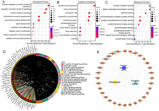 Pharmacological network analysis between malayoside and prostate cancer. (A–C). Go function enrichment diagram of the common targets of malayoside and prostate cancer. (D). KEGG pathway diagram of the common targets of malayoside and prostate cancer. (E). The compound-target-pathway-disease network of malayoside.