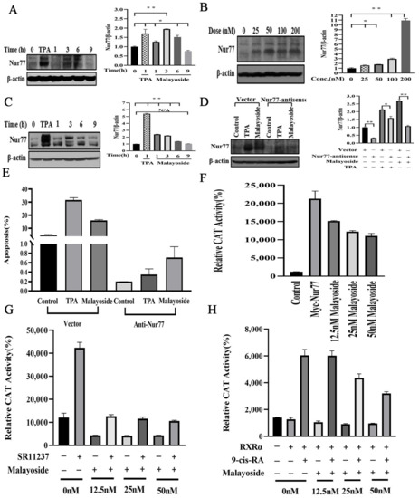 Correlation between apoptosis of malayoside and its induction of Nur77 expression. (A). Induction of endogenous Nur77 expression by malayoside in a time-dependent manner. LNCaP cells were treated at 100 nM of malayoside for 0, 1, 3, 6, and 9 h. (B). Induction of endogenous Nur77 expression by malayoside in a dose-dependent manner. LNCaP cells were treated at 25, 50, 100, and 200 nM of malayoside for 3 h, respectively. Bands were quantified and shown in the histogram. (C). Malayoside induced more Nur77 protein expression in Nur77 overexpressed LNCaP cells. LNCaP cells were transfected with vector or pCMV-Myc-Nur77 plasmid and treated with malayoside for hours as indicated. (D). Anti-sense Nur77 inhibited malayoside-induced Nur77 protein expression in LNCaP cells. All of the protein expression was detected by western blot. Western blot bands were quantified and shown in a histogram. The data are expressed as the mean ± SEM; * p < 0.05, ** p < 0.01. (E). Anti-sense Nur77 inhibited malayoside-induced apoptosis in LNCaP cells. Apoptosis was detected by FCM. The cells were treated with malayoside the same as in the previous experiment. (F,G). The inhibition of transcriptional activation of Nur77 by malayoside. LNCaP cells were transiently transfected as described in “Section 4”, treated with malayoside, and assayed for CAT activity after 24 h. (H). Inhibition of transcriptional activation of RXRα by malayoside. CV-1 cells were transiently transfected as described in “Section 4,” treated with malayoside, and assayed for CAT activity after 24 h.