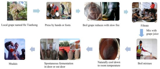 Traditional foods, which represent the heritage and dietary intake of a local geographical area, are key components for that particular region or country [1]. Msalais is a traditional wine mainly produced in Xinjiang, China, and it is produced by the Uygur ethnic group [2]. The production technique and quality of Msalais wine differs from conventional wine (Figure 1) [3]. It can be produced using the traditional method, but this is a time-consuming process. Condensed grape (Vitis vinifera Hetianhong) juice mainly prepared using an open hot cooking method from local cultivars [3]. After condensation, about two months of fermentation and 1 to 3 years of aging are needed at ambient temperatures [2]. Due to its strong regional characteristics and unique taste profile, in 2006, traditional Msalais wine was certified as a geographical indication protection product (Registration No. 5717691) by the national administration of quality supervision, inspection, and quarantine.