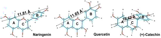 Optimized molecular structures of quercetin, catechin and naringenin and linear sizes of molecules (by ab initio method with 6-31G basis and unrestricted Hartree–Fock (UHF) method with Polak–Ribière gradient algorithm).