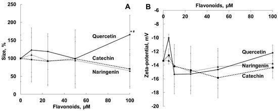 Effects of quercetin, catechin and naringenin on S. aureus cell diameter (A) and zeta-potential (B). Bacterial cells were suspended in PBS, pH 7.4. *—p < 0.05 in comparison with the cells in the absence of the flavonoids; #—p < 0.05 in comparison with the cells in the presence of other flavonoids.