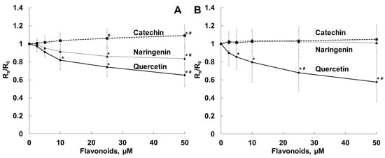 Dependence of fluorescence anisotropy of DPH, located in the hydrophobic region of the erythrocyte membrane (A), and TMA-DPH, located in the outer monolayer of the erythrocyte membrane (B), on the concentration of the flavonoids. Suspension of erythrocytes (0.01% hematocrit in PBS) was labeled with the fluorescent probes (DPH or TMA-DPH) at a concentration of 1 μM in the dark for 20 min at 37 °C, and then the flavonoids were added and incubated for 30 min at 37 °C. Anisotropy values were registered in the absence (R0) and in the presence (Rs) of the flavonoids. *—p < 0.05 in comparison with dye fluorescence anisotropy in the absence of the flavonoids; #—p < 0.05 in comparison with dye fluorescence anisotropy in the presence of other flavonoids.