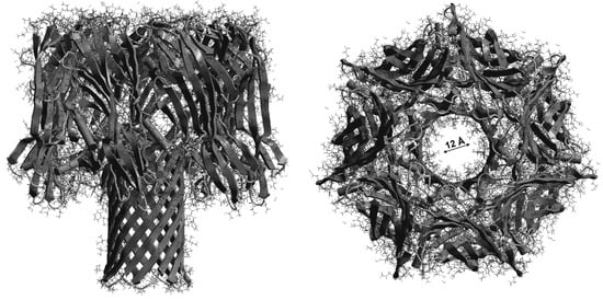 - Song, L.; Hobaugh, M.R.; Shustak, C.; Cheley, S.; Bayley, H.; Gouaux, J.E. Structure of Staphylococcal α-Hemolysin, a Heptameric Transmembrane Pore. Science 1996, 274, 1859–1865. [Google Scholar] [CrossRef]