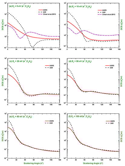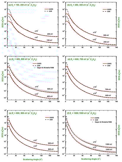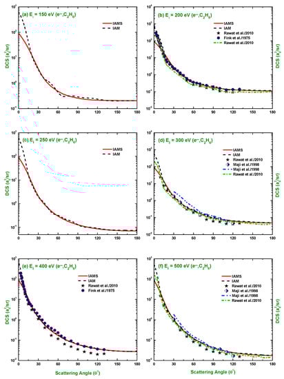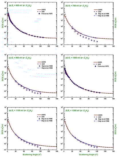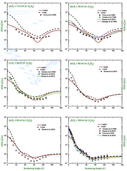 In Figure 1, Figure 2, Figure 3 and Figure 4, the DCSs, calculated using the IAM and IAMS, for electron scattering are compared with the experimental works of Curry et al. [] for 17.5 and 20 eV; Tanaka et al. [] for 20, 40, and 100 eV; Rawat et al. [] for 40, 60, 80, 100, 200, 300, 400, and 500 eV; Fink et al. [] for 100, 200, 400, 600, and 1000 eV; and Maji et al. [] for 300, 500, 700, 1100, and 1300 eV projectile energy. The other theoretical calculations are compared with Rawat et al. [] at 20, 40, 100, 200, 300, and 500 eV; Bettega et al. [] at 20 eV; and Maji et al. [] at 300, 500, 700, 900, 1100, and 1300 eV collision energy. There is no work found in the literature to compare with for the energies above 1300 eV, and the present is the only work at these energies for – scattering. The calculations at these energies were carried out to furnish future experiment for these energy points. As shown in Figure 1a,b, the calculated DCSs using IAM overestimate the cross-sections throughout the entire angular range, while those using IAMS fairly agree with other experimental measurements [,] and theoretical calculations [,] with slight differences in the pattern. Figure 1c,d show that the calculated DCSs using the IAMS agree both in pattern and magnitude with [,]. For energies eV, both of our calculations produce almost identical results and agree well with the cross-sections available in the literature both in magnitude and pattern. The similar DCSs produced by both the IAM and IAMS at higher energies reflect the fact that the de Broglie wavelengths of the incident electron at these energies are small compared to the inter-atomic distances of the target for which the projectile interacts only with the constituent atoms, and there is no effect due to the overlapping of the orbitals. The low-energy failure of the IAM can be attributed to ignoring the redistribution of atomic electrons due to molecular binding and multiple scattering within the molecule and considering the constituent atoms as independent scatterers. However, the low energy failure of the IAMS is due to the semi-classical nature of the incorporated screening correction, the low energy limitation of the optical model, and the intrinsic low energy limitation of the IAM. From Figure 2e,f, we see that the experimental DCS of Rawat et al. [] and Fink et al. [] show disagreement with each other above ∼. Moreover, from Figure 3, we see that the present theoretical model and that of Maji et al. [] agree with the experimental DCS data of Fink et al. [], but disagree with that of []. These disagreements depict the fact that the experimental data might contain ambiguities and theoretical models are required to overcome the ambiguities persisting in the experimental data, as well as helping to furnish future experiments.