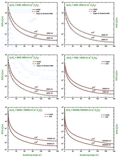 There is no experimental measurement for the DCS found in the literature for the scattering of positrons by to the best of our knowledge, and our calculated DCSs using the IAM and IAMS approaches were compared with the theoretical calculations of Chiari et al. [] at 5 and 10 eV and the data generated by employing the additivity rule on the atomic DCS data of Dapor and Miotello [] at 500, 1500, 2000, 2500, 3000, 3500, and 4000 eV collision energy. The comparison made in Figure 5a,b clearly depicts that our calculated DCSs and those by Chiari et al. [] disagree significantly, both in magnitude and pattern. This disagreement might be due to the choice of different procedures and potentials. More data, both experimental and theoretical, are needed to bring out the more acceptable illustration of the positron impact DCS. It is evident from Figure 6c,f and Figure 7a–c that both the IAM and IAMS produce similar DCSs, both in magnitude and pattern, as those by the AR of Dapor and Miotello [] with slight underestimation at 500, 1000, and 1500 eV. Here, again, the cross-sections are reduced at lower scattering angles using the IAMS over the IAM. As mentioned earlier, there is only one work (theoretical) found in the literature on – DCSs; the present study is, therefore, extremely useful to benchmark a theory. The work of Chiari et al. [] was limited to 10 eV projectile energy only, while the present study covered the calculation of DCSs over a wide range of incident energy (1 eV–1 MeV), as presented in Figure 5, Figure 6 and Figure 7. Thus, the present work can be useful to furnish future experiments on positron scattering by .