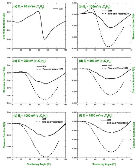The knowledge of spin polarization or the Sherman function is important for projectile–molecule scattering, as it can furnish the details of the scattering process. As such, in the present study, we investigated the spin polarization for the scattering of electrons and positrons by over the collision energy –1500 eV in terms of the IAM approach. Figure 8 displays the spin polarization for the scattering of electrons, while that for positrons is shown in Figure 9. The predicted spin polarizations were compared with the calculations obtained by applying the additivity rule on the atomic spin polarization calculations of Fink and Yates []. In Figure 8a, a rapid change in sign and magnitude of is observed near ∼100 that matches the minimum observed in the electron impact DCS at 20 eV. This rapid change in the value of the Sherman function is observed near a minimum in the angular distribution of electrons scattered elastically []. Thus, the predicted Sherman function manifests the behavior of the experimental observation. We see from Figure 8 that after , no rapid change of sign occurs in . There is no study found in the literature for positrons spin polarization, and the present work is the first one to calculate the for – scattering. The sign uniformity over the whole angular range and the small magnitude of the positron impact Sherman function indicates that the positron impact DCS does not contain a significant extremum.