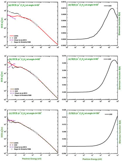 The energy dependence of the DCS and for electron scattering at scattering angles , , and is shown in Figure 10. These angles were chosen to cover both forward and backward scattering. The comparison made in Figure 10a,b clearly shows the success of the IAMS over the IAM in producing the DCS for electron scattering. While the IAM produces an overestimated DCS, particularly at lower projectile energies up to about 100 eV, the IAMS results closely resemble the experimental measurements of [,,,,,] at and angle of scattering. As is evident from Figure 10d,e, the value of the electron at becomes highest as 0.0001, corresponding to 30 eV at and becomes maximum as 0.0015, corresponding to 8 eV incident energy. At angle of scattering, increases slightly with energy up to 60 eV, then decreases monotonously up to eV projectile energy. The energy dependence of the positron DCS and is shown in Figure 11 at the same scattering angles of , , and and compared to the theoretical calculations of Chiari et al. [] and Dapor and Miotello []. Our calculated cross-sections using the IAM and IAMS do not agree in pattern and magnitude with the work of Chiari et al. []. On the other hand, both of our calculations agree well with [] for the DCS of – scattering. At , the becomes steady up to 300 eV, then increases smoothly with the incident energy.