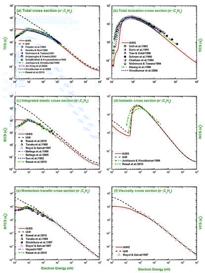 (a) TCS, (b) TICS, (c) IECS, (d) INCS, (e) MTCS, and (f) VCS for the scattering of electrons from . Theoretical works: IAM, IAMS, Joshipura and Vindkumar [], Jin-Feng et al. [], Vinodkumar et al. [], Rawat et al. [], Hwang et al. [], Mayol and Salvat [], Bettega et al. [,], Sun et al. [], and Hayashi []; Experimental works: Floeder et al. [], Sueoka and Mori [], Nishimura and Tawara [,], Ariyasinghe and Powers [], Szmytkowski and Krzysztofowicz [], Grill et al. [], Duric et al. [], Tian and Vidal [], Schram et al. [], Chatham et al. [], Rawat et al. [], Tanaka et al. [], and Shishikura et al. [].