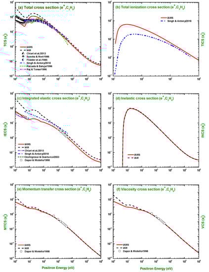 (a) TCS, (b) TICS, (c) IECS, (d) INCS, (e) MTCS, and (f) VCS for the scattering of positrons from . Theoretical works: IAM, IAMS, Singh and Antony [], Raizada and Baluja [], Raj and Tomar [], Chiari et al. [], Occhigrossi and Gianturco [], and Dapor and Miotello []; Experimental works: Chiari et al. [], Sueoka and Mori [], and Floeder et al. [].