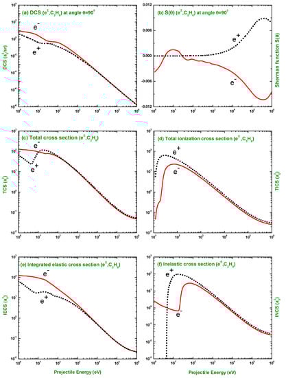 In Figure 14, the electron impact observable quantities are compared with those for positron impact. It is evident from Figure 14a that the DCSs for electron scattering were found to be higher in magnitude than those for positron scattering up to ∼2000 eV. Beyond this energy, the electron and positron DCSs have almost the same values. The CPP and the static potential (SP) hold the same sign during electron interaction and the opposite sign during positron interaction. Due to the opposite sign, these two potentials show annulment behavior of each other in the positron interaction. For this cancellation tendency of the CPP and SP and the absence of the exchange potential, the positron impact DCS is smaller than that of the electron impact at low energies. At high energies, the effect of polarization and exchange decreases and the static potential starts to dominate. As a result, the difference between the high-energy cross-sections for electrons and positrons diminishes. It is seen from Figure 14b that the electron impact exhibits some interference structures and the positron impact , smooth behavior at lower incident energies. Perhaps this is due to the exchange potential. Anti-symmetry between the electron and positron impact Sherman function is observed at high incident energy. The higher value of for positron scattering at higher energies compared to that for electron scattering is due to the effect of the Coulomb potential. This finding of large at higher energies for positron scattering is in agreement with the work of Akter et al. [] for . The comparison of the (c) TCS, (d) TICS, (e) IECS, and (f) INCS between the scattering of electrons and positrons is also displayed in Figure 14. The effect of the aforementioned causes is clearly visible at lower incident energies, where the cross-sections for electron scattering were found to be different both in magnitude and pattern. It was also observed that most of the differences were observed within ∼1000 eV. At higher energies, the scattering observables follow a similar trend for both electron and positron scattering.