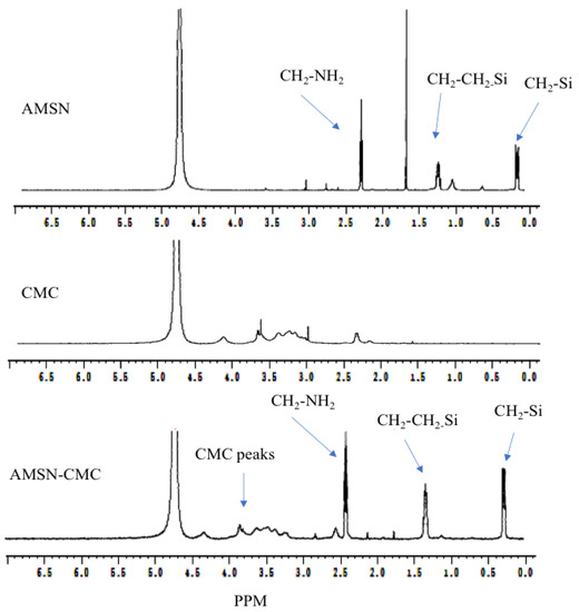 The 1H-NMR spectra of AMSN, CMC, and coated AMSN-CMC are presented in Figure 2, while the chemical structures of AMSN and CMC are illustrated in Figure 3. The freeze-dried samples were solubilized in sodium hydroxide and measured in D2O because the spectra were not clear when measured directly in D2O. The spectrum of AMSN was in good agreement with mesoporous silica nanoparticles functionalized with APTES in an alkaline medium found in the literature [16,17,18,19]. The three methylene groups of the 3-aminopropyl group appear at 2.26 (CH2 connected to N), 1.2 (middle CH2), and 0.1 ppm (CH2 connected to Si), respectively. The hydrogen peaks were shifted to lower ppm due to the measurement of the sample in an alkaline media [16]. The strong peak at 2.2 ppm could be due to impurities in the sample. These peaks further confirmed the successful preparation of AMSN illustrated in the previous work [15]. The NMR spectrum of CMC showed a peak at 2.4 ppm, which could be related to the CH3 in the acetamide groups. The small peak at 4.17 ppm could be related to the carboxymethyl protons (-O-CH2-COOD) in the CMC [20,21,22]. In addition, all distinctive peaks of CMC were retained in good agreement with the NMR spectrum of this polymer found in the literature [20,21,22]. Moreover, all peaks of AMSN and CMC were retained in the AMSN-CMC spectrum suggesting the successful coating of AMSN with CMC.