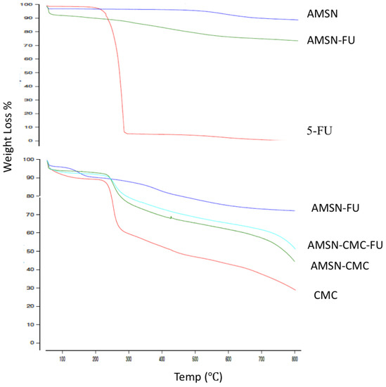 Differences in the thermograms were apparent between the AMSN and AMSN-FU (Figure 4). TGA analysis was carried out to calculate the overall amount of 5-FU loaded into AMSN (Figure 4). The obtained values were in good agreement with the drug loading measured by indirect methods using HPLC (around 15%). The reference thermograms of pure 5-FU and pure AMSN were measured for comparison. The thermogram of 5-FU was characterized by a considerable weight loss at 276 °C due to the drug decomposition process. The thermogram of pure AMSN showed low weight loss in the temperature range of 40–800 °C, which suggested the high thermostability of AMSN. The weight loss of AMSN was around 11% and the difference in weight loss between AMSN and loaded AMSN-FU was considered to arise from the amount of the drug loaded inside the nanoparticles [23,24]. The thermograms of AMSN-CMC and AMSN-CMC-FU showed a large weight loss due to the loss of CMC from the surface of AMSN. The mass ratio of the coated CMC layer on the surfaces of AMSN was around 45% for AMSN-CMC and around 40% for AMSN-CMC-FU. These thermograms confirmed the successful coating of AMSN with CMC. In addition, AMSN-CMC-FU showed slightly lower weight loss than drug-free AMSN-CMC due to the replacement of a part of the high molecular weight CMC polymer with 5-FU [7,25].