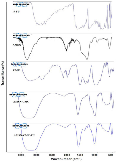 The FTIR spectra of 5-FU, AMSN, CMC, AMSN-CMC, and AMSN-CMC-FU are presented in Figure 6. The spectrum of AMSN showed a peak at 1046 cm−1, which was the peak of the Si-O-Si group. A peak observed at 1550 cm−1 and a broad peak between 2900 and 3400 cm−1 were assigned to N-H bending and stretching vibrations of primary amines, respectively. The peak at 1468 cm−1 could be due to the bending vibrations of either ammonium ion N-H bonds or the methylene C-H bonds. The CMC spectrum showed the characteristic peaks of CMC at 1599 and 1405 cm−1, indicating the presence of carboxy and carboxy methyl groups, respectively. Two peaks at 1082 and 1323 cm−1 were assigned to the C-O stretching band and a merging of the carboxymethyl group at the OH group was present in the C6 position of CMC. A broad peak around 3300 cm−1 indicated O-H stretching and intermolecular hydrogen bonds of the polysaccharide. In the spectrum of AMSN-CMC, the 1049 cm−1 peak could be assigned to Si-O-Si stretching. The band retained at 3300 cm−1 indicated the effective bonding of CMC to AMSN. Additionally, a peak at 1635 cm−1 indicated free COOH groups on the surface. The strong peaks of 5-FU disappeared from the AMSN-CMC-FU spectrum, suggesting successful encapsulation of 5-FU. Overall, the FTIR results confirmed the successful surface functionalization of AMSN by CMC and encapsulation of 5-FU inside AMSN [15,26].