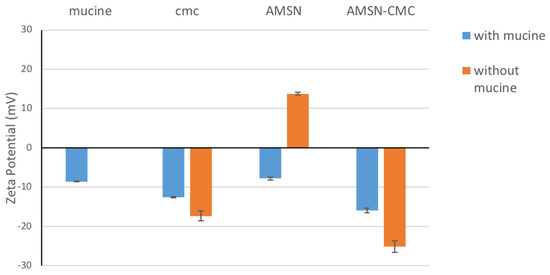 Change in the zeta potential of AMSN and AMSN-CMC nanoparticles after incubation with mucin.