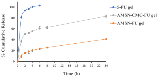 In vitro release of 5-FU gel, AMSN-FU gel, and AMSN-CMC-FU gel. The values are represented as the mean of three measurements with standard deviation (Mean ± SD, n = 3).