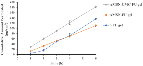 Ex vivo permeation of AMSN-FU gel, AMSN-CMC-FU gel, and 5-FU gel. The results are the mean of three measurements with standard deviation (Mean ± SD, n = 3).