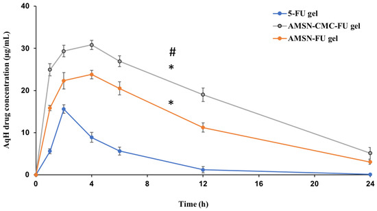 5-FU concentrations in AqH following topical ocular instillation of 5-FU gel, AMSN-FU gel, and AMSN-CMC-FU gel in rabbit eyes (mean ± SD, n = 3). * Represent the significant difference between the AMSN-CMC-FU gel or AMSN-FU gel parameters in comparison to the 5-FU gel. # Represent the significant difference between AMSN-CMC-FU gel and AMSN-FU gel.