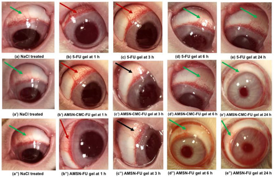 Normal features of eyes were observed in the treated rabbits during irritation testing of normal saline. Figure 11a,a’,a” are the representative images of normal saline-treated eyes. The 5-FU formulations treated animals exhibit inflammatory signs showing redness of the conjunctiva with mild mucoidal discharge (red arrow) 1 h post-application of 5-FU gel, AMSN-CMC-FU gel, and AMSN-FU gel (Figure 11b,b’,b”), respectively. The three treated rabbits with 5-FU gel exhibited moderate inflammatory signs and slight watery discharge even at 3 h (Figure 11c, red arrow), while AMSN-CMC-FU gel- and AMSN-FU gel-treated animals demonstrate mild inflammatory signs in the eyes at 3 h (Figure 11c’,c” black arrows). Mild inflammatory changes by these two formulations at 3 h were probably because of the limited or low toxicity of the 5-FU-containing formulations as well as attributed to the controlled release of the encapsulated drug. None of the treated rabbits showed inflammatory signs (such as redness of conjunctiva with mucoidal discharge) represented by green arrow 6 h and 24 h post administration of 5-FU gel, AMSN-CMC-FU gel, and AMSN-FU gel (Figure 11d,d’,d”) and (Figure 11e,e’,e”), respectively. The inflammatory changes in the conjunctiva, iris, and cornea disappeared and the treated eyes regained their normalcy 24 h post administration of 5-FU gel, AMSN-CMC-FU gel, and AMSN-FU gel [45].