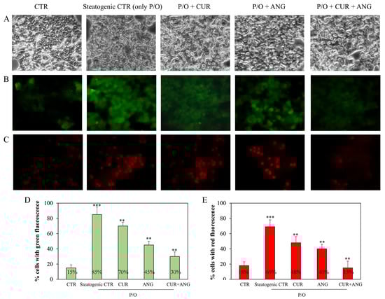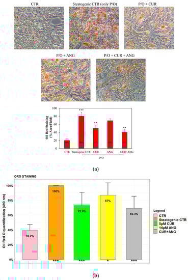 2.2. Andrographolide–Curcumin Association reverted Lipid and Trygliceride Accumulation in Steatosis Hepatocyte Model