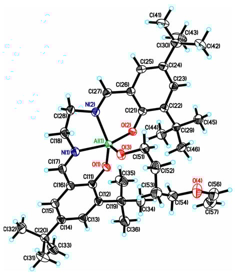Aluminum alkoxides, due to their low toxicity, high Lewis acidity, wide abundance, and low cost, find application in chemistry, material science, and related fields of science. Examples are numerous catalysts in organic synthesis [1,2,3,4,5,6,7], the activation of small molecules (such as carbon dioxide) [8,9,10,11], description of the synthesis of complexes with unusual structures [12,13], precursors for sol-gel technology [14] or OLED and optic materials [15,16,17] based on Al compounds. At the same time, there are many works concerning the application of aluminum alkoxides based on different ligands as initiators [18,19,20,21,22,23] in ring-opening polymerization (ROP) [24,25,26,27,28] of lactones and lactide for the synthesis of biodegradable polymers. This method of polymerization differs from an alternative way of preparing polyesters such as polycondensation [29,30] by a more controlled character of polymerization that allows obtaining (co)polymers with target molar mass and low polydispersity as well as high end-group fidelity. Beginning with works by Spassky [31], Al complexes based on salen (bis(salicylaldiimine)) type ligands [20,32,33,34,35,36,37,38,39,40,41,42,43,44,45,46,47,48,49,50,51,52,53,54] found wide application in this field due to simple synthesis, various structures, and good polymerization control. Moreover, Atwood et al. [55] continue to apply Al salen complexes in organometallic and coordination chemistry. Despite a significant progress in this field of science, the development of new catalysts with precise structure, which may be used for construction of new materials, is a challenge for modern chemistry.