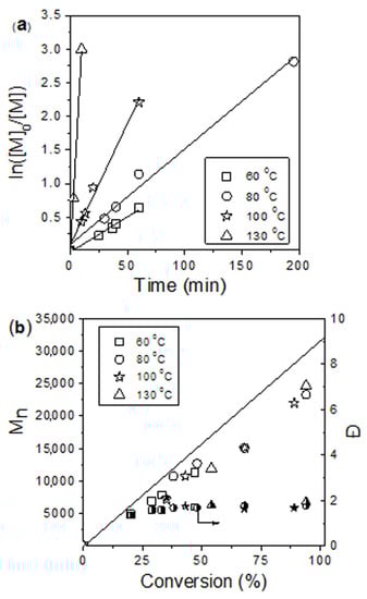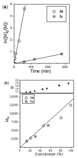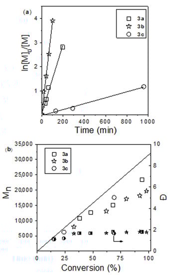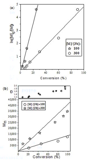(a) ln[M]0/[M] vs. time; (b) Mn, Ð vs. conversion dependences for the bulk D,L-lactide polymerization for complex 3b at 130 °C and at different [M]/[catalyst] ratios. The straight lines in Figure 6b correspond to the theoretical molecular weight calculated as Mn(theor) = ([D,L-lactide]/[catalyst]) × 144 × Conversion + 115. Experimental values of the molecular weight determined by SEC vs. polystyrene standards were corrected by a factor of 0.58 [85].
