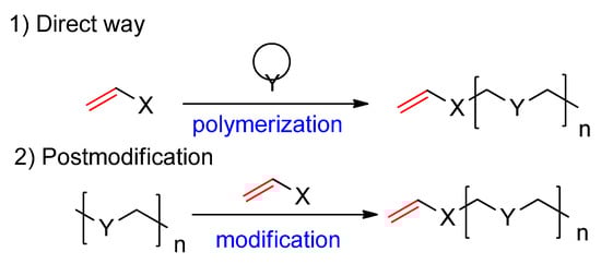 To date, there are generally two main approaches to macromonomer synthesis (Scheme 1). The first includes the direct growth using a functionalized initiator, usually a simple organic compound (or more elaborate ways, i.e., atom transfer radical polymerization, ATRP; reversible addition−fragmentation chain transfer, RAFT; or catalytic chain transfer polymerization, CCTP) in the presence of a catalyst [64,65,66,67]. At the same time, it should be mentioned that the isolation of individual catalysts is more significant than the investigation of catalytically active metal systems based on modified reagents [68,69,70,71,72,73,74,75]. The second way is to use the post-polymerization modification of previously obtained polymers [76,77,78,79,80,81,82].