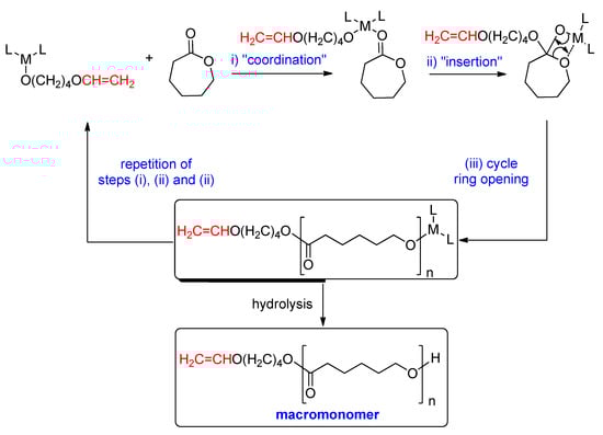 In accordance with the single-site catalyst theory, the “insertion—coordination” mechanism (compare with the “activated monomer mechanism”) [83] has been accepted for the ROP of lactones. In continuation of our research [84,85] in this field, we propose the directly controlled synthesis of macromonomers (Scheme 2). It should be noted that this synthesis strategy proposes the application of isolated and characterized metal initiators. This technique differs significantly from other ways of end-chain-modified macromonomer synthesis.