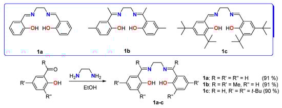 The salen ligands 1a–c (Scheme 3) differ by the presence of alkyl substituents in phenolic and iminic parts. The simplicity of their synthesis [89] (the reaction of ethylenediamine with the corresponding carbonyl compound in a 1:2 molar ratio) and high yields (more than 90%) are the main advantages of applying salen compounds. Ligand 1b is a new compound.
