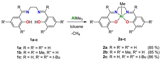 Complexes 2a-c were obtained by the interaction of the corresponding ligands with a solution of trimethylaluminum in equimolar amounts (Scheme 4). This reaction is performed in mild conditions giving the target compounds with high yields (more than 86%). It should be noted that only a gaseous by-product, methane, is produced in the reaction of alcohols and phenols with aluminum derivatives containing Al-Me bonds.