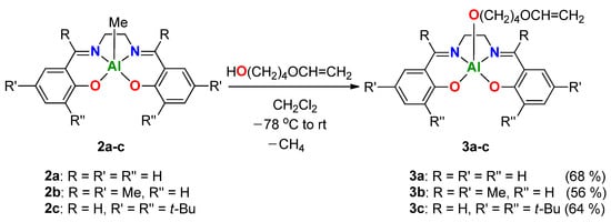 The strategy including two stages was chosen for the synthesis of target-modified aluminum complexes. At the first stage, the corresponding methyl complexes, SalenAlMe, 2a–c, would be obtained. At the second stage, the methyl group would be substituted by unsaturated alcohol, giving the target 3a–c.
