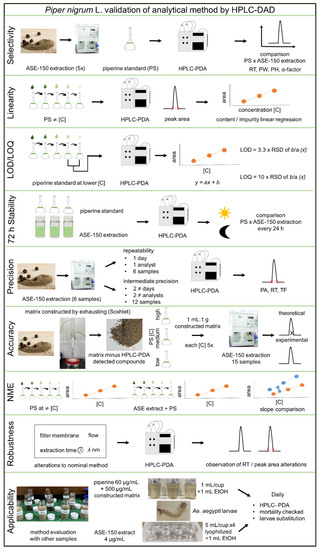 Overview of the steps involved in validating the Piper nigrum fruit (black pepper) ethanolic extract analytical method and its application in Ae. aegypti larvicidal assays.