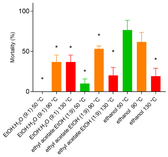 Aedes aegypti L3 larvae mortality after 24 h exposure to different Piper nigrum extracts (1.9 µg/mL). EtOH: ethanol; H2O: distilled water. * Significant statistical difference (p < 0.05) when compared to 50 °C-prepared ethanolic extract by one-way ANOVA and Dunnett’s post hoc test.