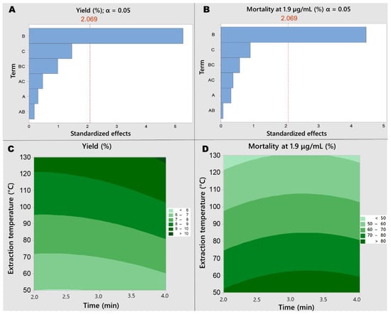 Pareto charts and contour scales of the responses applying Box–Behnken design to Piper nigrum extractions. (A): Pareto chart for yield. (B): Pareto chart for Aedes aegypti larvae mortality (1.9 μg/mL, 24 h). y-axis Term: A-time; B-temperature; C-sample quantity. Broken red line indicates statistically significant effects (Student’s t-test, 95% confidence level). (C): contour scale for yield. (D): contour scale for Aedes aegypti L3 larvae mortality (1.9 μg/mL, 24 h). Sample quantity: 3 g.
