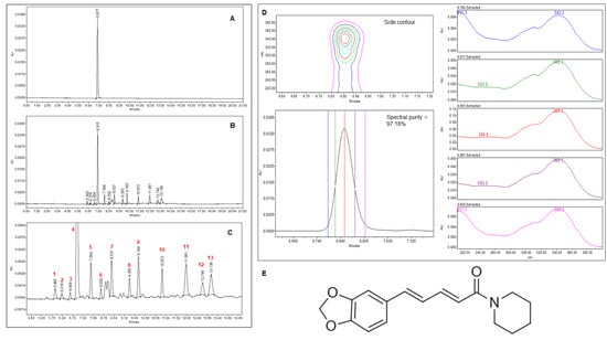 Analytical methodology development involved evaluating different conditions: stationary/mobile phases, elution gradient, PDA-UV detector wavelength and filter membranes to obtain the best chromatographic profile for the optimized extract (Section 3.1). Selectivity was obtained by comparing the standard piperine solution profile (Figure 4A) with the extract (Figure 4B,C), targeting adequate separation of the major compound (piperine) from the other peaks. Thirteen peaks, including piperine, were monitored considering: retention time, α factor, peak height and width. We were able to observe adequate selectivity, whereby the standard deviation for all chromatographic variables was <5%, with piperine spectral purity determined using the average of 5 UV spectral peak data (Figure 4D). All of the raw data for selectivity is presented in Table S2.