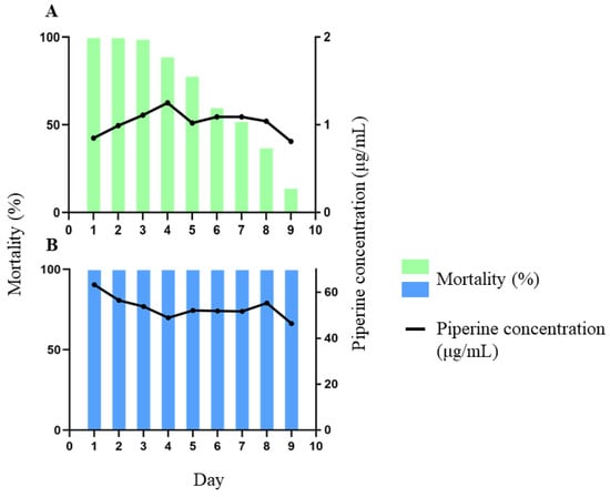 After LC50/LC90 determination, 60 μg/mL piperine and 4 μg/mL extract were selected for residual larvicidal activity investigation (Section 3.8), and the piperine was quantified daily to understand the behavior of this major compound. However, piperine did not achieve adequate solubility at this test concentration, with precipitation observed. Therefore, the addition of the exhausted matrix to the test solution ensured accuracy by enabling piperine solubility. Another challenge was analytical error determination during piperine quantification in water. Three different piperine solutions were prepared in plastic cups: 47.3 µg/mL (error 37%), 23.6 µg/mL (error 41%) and 4.58 µg/mL (error 54%). The corresponding errors that were determined were applied as a correction factor in the piperine quantification calculation during the residual larvicidal assay. As the aforementioned quantification obstacles were overcome, the piperine and standardized extract assays were performed according to Section 3.8. The daily mortality (%) and absolute piperine concentration (µg/mL) results of the 9-day test are shown in Figure 5.
